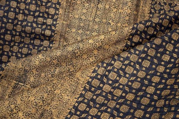 一旦表面光滑平整,雕刻图案的小木块就被涂上阿拉伯胶;然后将积木轻轻压在布料上。在胶水干之前,在图案的顶部压上一片金箔,当所有的图案都干了之后,再用贝壳把织物擦亮。”