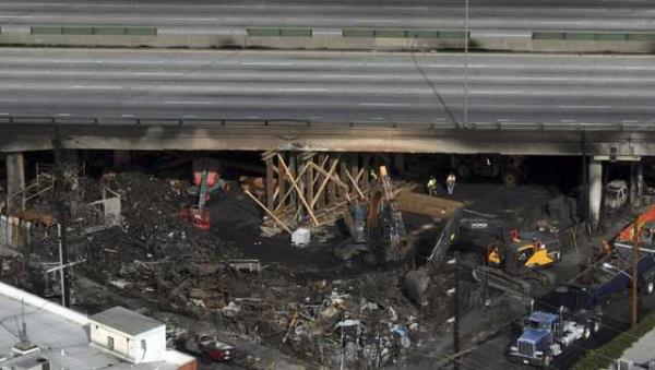 周六,10号州际公路下的两个仓库发生火灾,建筑材料迅速燃烧,火势不断扩大。它使许多柱子烧焦、碎裂,甲板护栏扭曲。为了清理废墟的工人的安全,工作人员支撑着受损最严重的部分。目前还不清楚大火对高速公路造成了什么结构破坏。