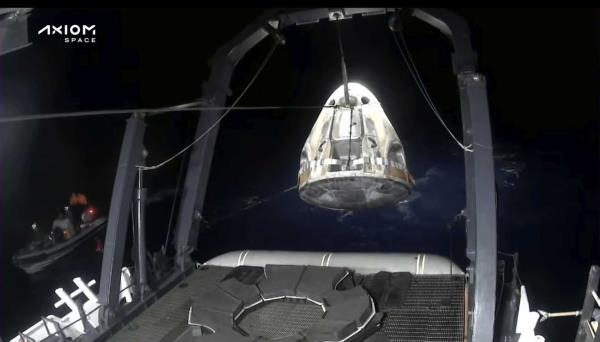 搭载四名宇航员的SpaceX太空舱在脱离轨道实验室12小时后,降落在佛罗里达州狭长地带附近的墨西哥湾。