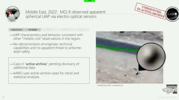 “UAP的特征和行为与该地区其他“金属球”的观测结果一致,”AARO在委员会上播放的视频中附带的幻灯片说。