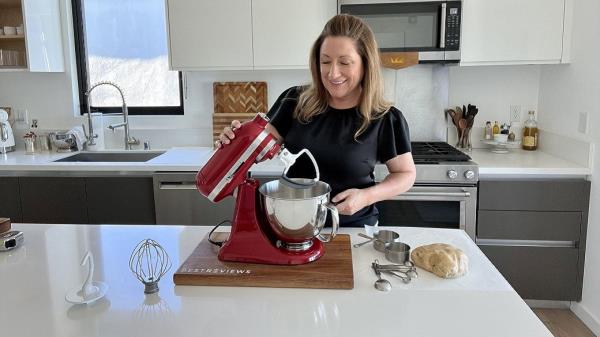 我们很喜欢这款立式搅拌机的手柄,因为它很轻,所以在我们测试的四款搅拌机中,它是最容易进出橱柜的。虽然它是一个小机器,但由于它的吸盘脚,这个立式搅拌器在搅拌时不会移动。它在所有的速度设置上混合得很好,使用与KitchenAid相同的行星混合动作。此外,它比KitchenAid便宜得多,价格几乎是它的三分之一。然而,倾斜头机构依赖于弹簧加载的铰链,需要两只手来操作;否则,脑袋会向后一甩,弄得一团糟。