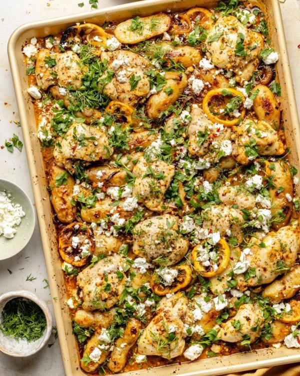 烤盘香草柠檬大蒜鸡肉和土豆做一顿美味的晚餐并不一定意味着你要洗很多盘子。从雄心厨房获取食谱