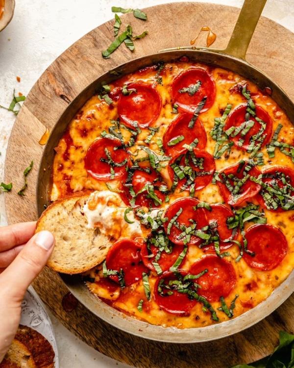 尼和罗勒意大利辣香肠披萨蘸酱形式的披萨是我们梦想中的小吃。从雄心厨房4获取食谱