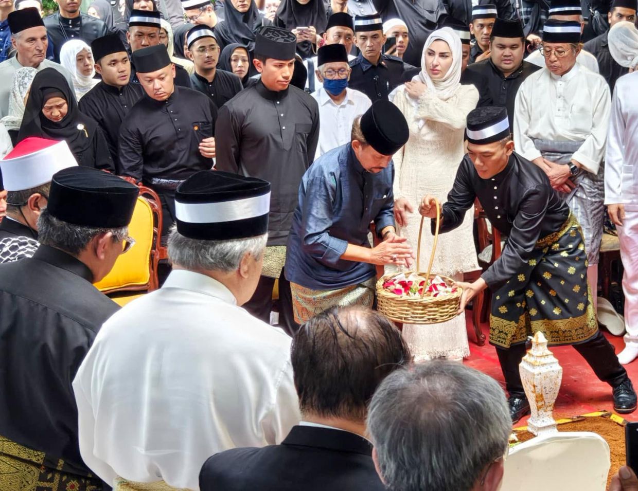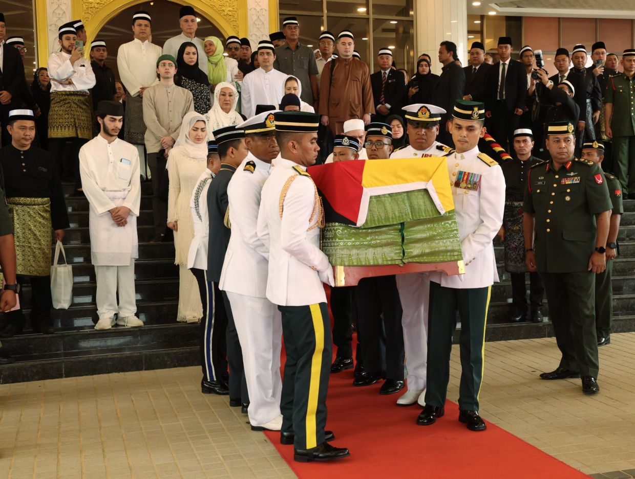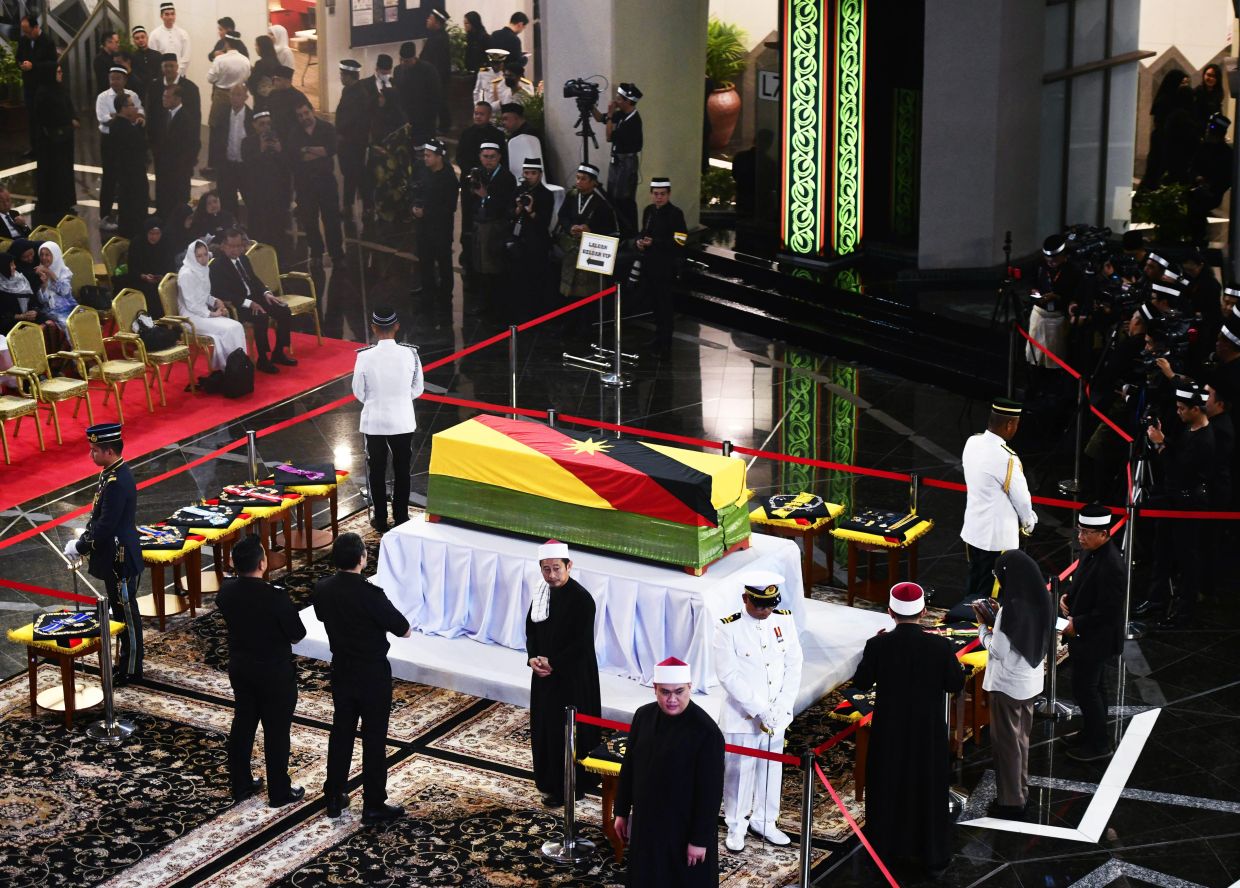 随着细雨落下,文莱苏丹哈桑纳尔·博尔基亚率领一群政要在坟墓上撒花瓣。