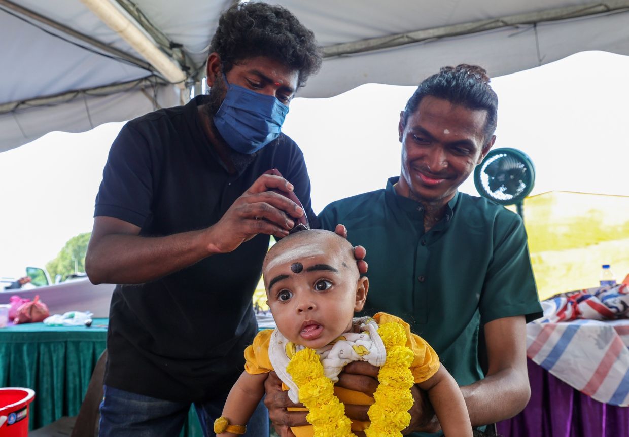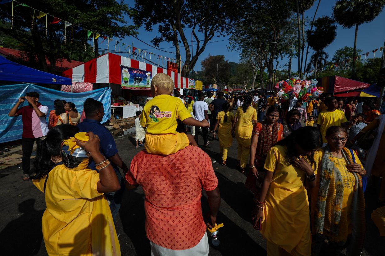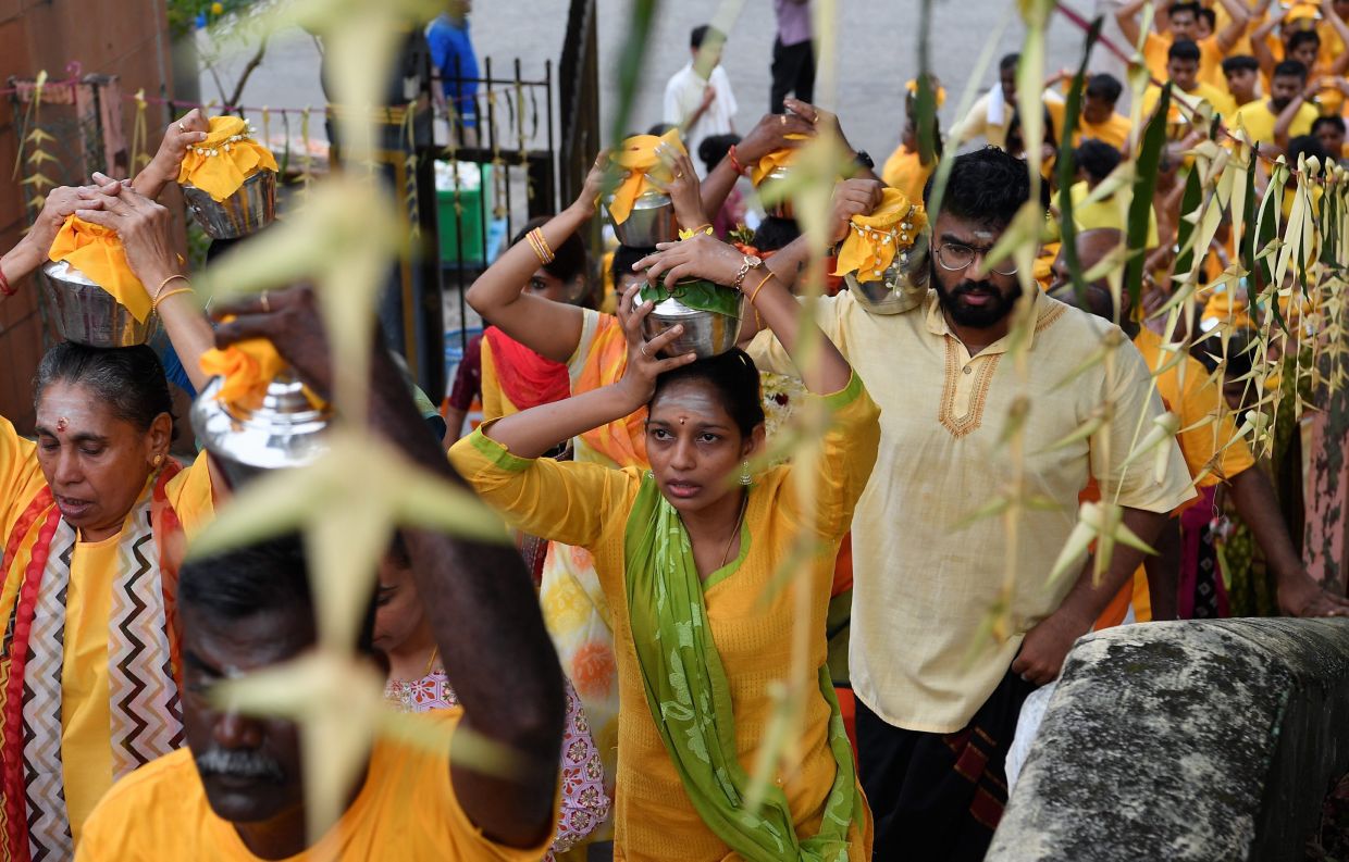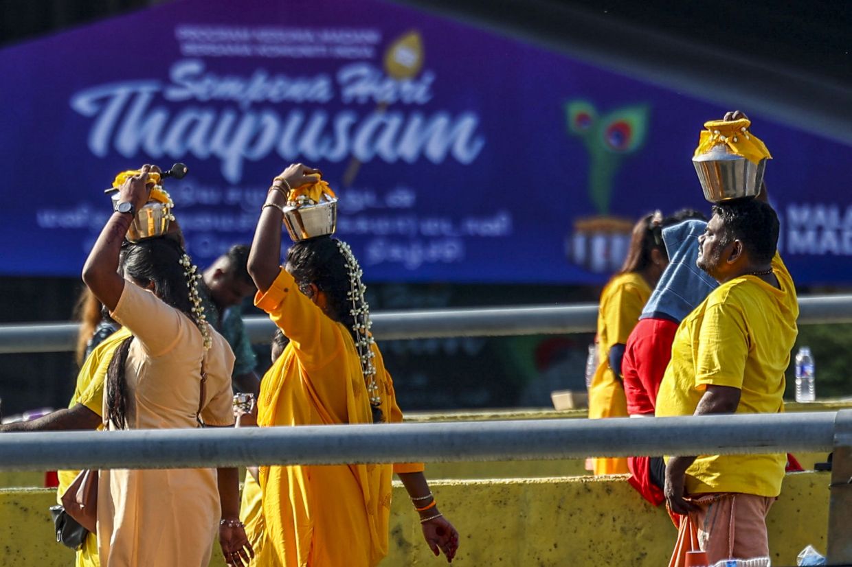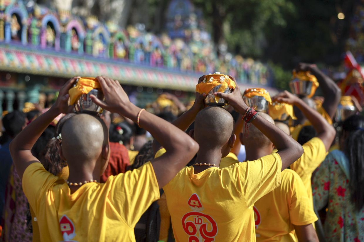 成千上万的人继续聚集在巴图洞穴的Sri Subramaniar Swamy寺庙,这里是该市每年庆祝活动的中心,信徒们早在早上7点就开始到达寺庙,一些人拿着Paal Kudam(牛奶罐)和kavadis,而其他人则砸碎椰子,剃光头发,以履行各自的誓言。