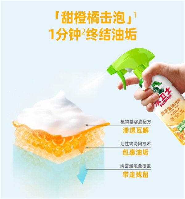 清洁剂配备了双功能喷头,可以根据不同污渍类型进行针对性清洁。无论是灶台油垢还是油烟机积油,都能轻松应对。特别添加的天然甜橙油成分,在保证强力去污效果的同时,还能带来清新的柑橘香气。