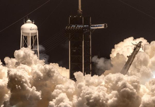 继周日晚上10点53分发射后,搭载宇航员的Space X龙飞船乘坐猎鹰9号火箭进入轨道,预计将于周二凌晨3点左右与空间站对接。