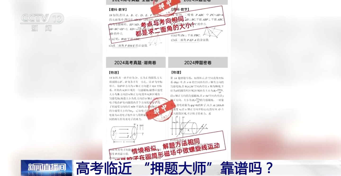 以2024年高考真题为例,某款“AI高考押题卷”声称押中了多道题目,但仔细对比后却发现,所谓的“押中”标准极为宽泛。例如,一道数学几何题,真题考查的是五面体,而押题卷则是三棱锥,题干和设问完全不同,仅因为都涉及“二面角的大小”这一考点,就被判定为“押中”。这种牵强的判定方式显然与考生的实际需求相去甚远。