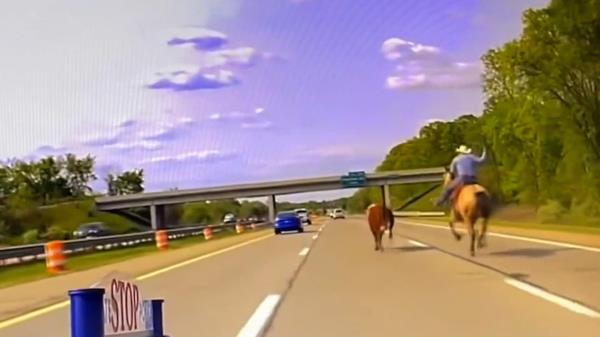 在推特上发布的一段密歇根州警方行车记录仪视频中(视频中充斥着“天哪”和“我不知道密歇根州还有牛仔!”之类的评论),可以看到利特尔约翰在州际公路中央追赶公牛,自信地在头顶上旋转绳子。