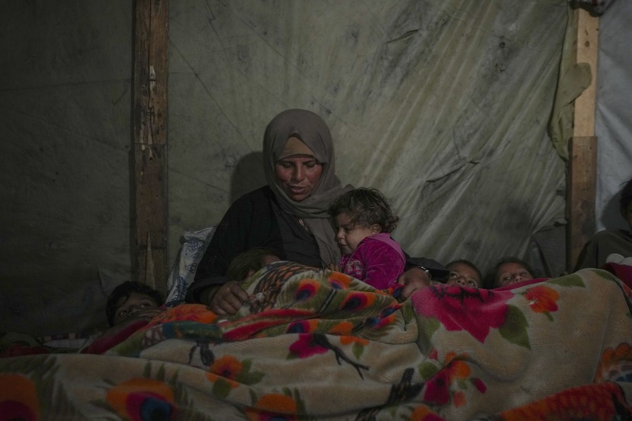 50岁的瑞达·阿布·扎拉达(Reda Abu Zarada)和家人一起从加沙北部流离失所,她说大人们抱着孩子睡觉,让他们在帐篷里取暖。