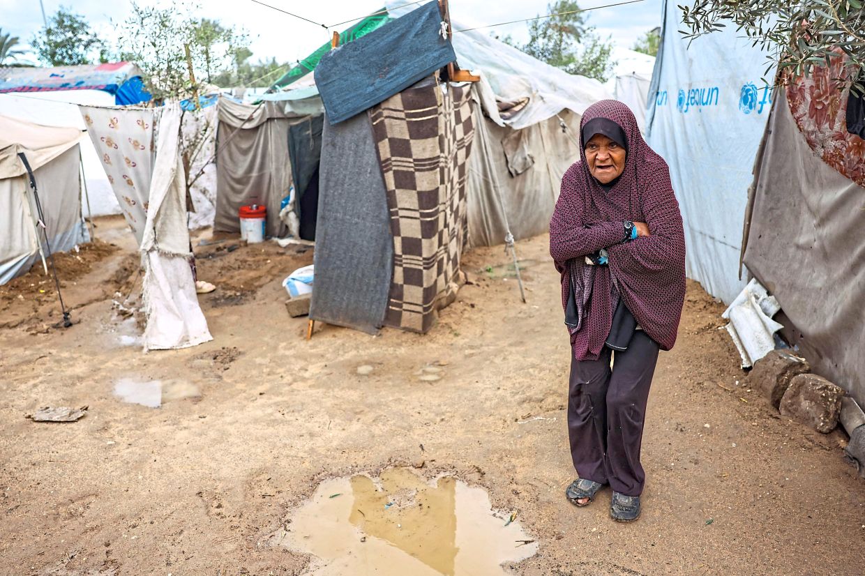 Shadia Aiyada从南部城市Rafah流离失所到沿海地区Muwasi,她只有一条毯子和一个热水瓶来防止她的八个孩子在脆弱的帐篷里瑟瑟发抖。