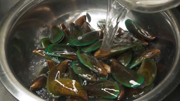 用刷子刷洗贻贝,去除污垢、沙子和藤壶。