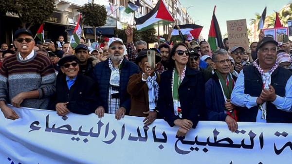 成千上万摩洛哥人星期天在摩洛哥首都卡萨布兰卡举行亲巴勒斯坦的最新集会,走上街头,要求加沙地带永久停火,并中止摩洛哥与以色列的关系。