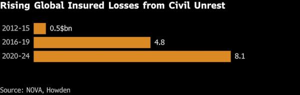与“罢工、暴动与民变”相关的索赔,正成为保险公司越来越头疼的问题,因为在西方民主国家,动荡事件日益导致财产损毁。豪顿再保险估计,与此相关的承保损失从2013年可忽略不计的水平,飙升至2020年至2024年间的80多亿美元。