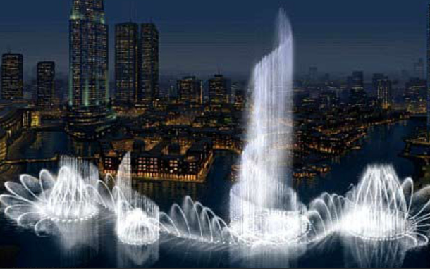 迪拜喷泉是一个精心设计的喷泉系统,位于12公顷(30英亩)的人工哈利法塔湖上,位于阿拉伯联合酋长国迪拜市中心发展的中心。它是由WET Design设计的,这家总部位于加州的公司还负责拉斯维加斯Bellagio酒店湖上的喷泉。它由6600盏灯和50个彩色投影仪照明,长275米(902英尺),能将高达500英尺(152.4米)的水射向空中,并伴随着一系列古典到当代阿拉伯和世界音乐。它的建造成本为8亿AED(2.18亿美元)。