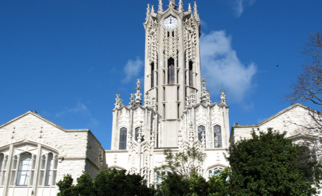 市立校园的钟楼(旧艺术楼)。该建筑被列为“一类”历史遗迹,于1926年完工。这是公司 被认为是奥克兰的地标和大学的标志。大学宿舍,以前是犹太教堂,由大学租用