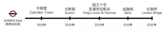 从项目出发步行2分钟即可到达当地的地铁站-Mill Hill East,搭乘黑线(Northern Line)可迅速到达伦敦市中心。乘地铁22分钟可达国王十字,莱斯特广场27分钟便可到达,半小时内可达牛津街,邦德街,Selfridges等中心要地。