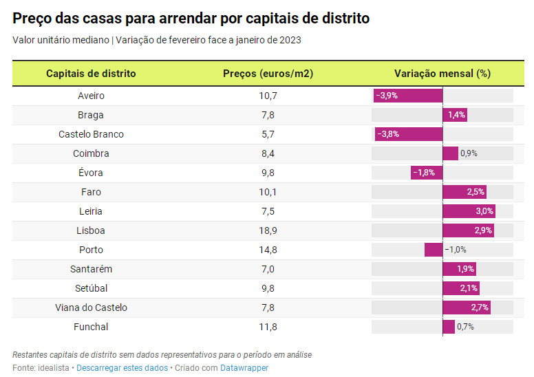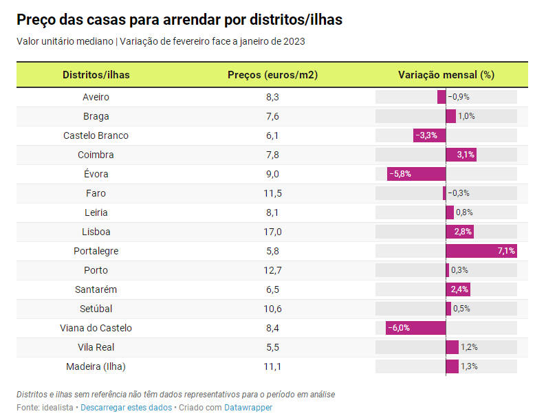 最昂贵的租房区排名由里斯本(17欧元/平方米)领衔,其次是波尔图(12.7欧元/平方米)、法罗(11.5欧元/平方米)、马德拉岛(11.1欧元/平方米)、塞图巴尔(10.6欧元/平方米)、埃武拉(9欧元/平方米)、维亚纳堡(8.4欧元/平方米)和阿维罗(8.3欧元/平方米)。接下来是莱里亚(8.1欧元/平方米)、科英布拉(7.8欧元/平方米),布拉加(7.6欧元/平方米)和圣塔伦(6.5欧元/平方米)。