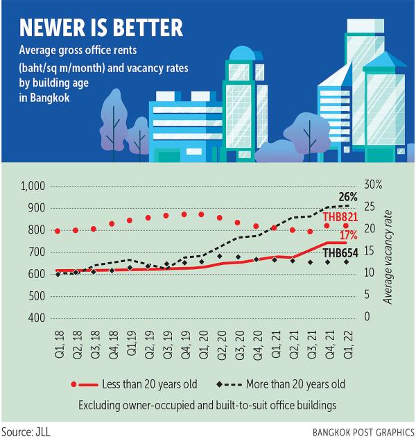 仲量联行的最新研究显示,曼谷的办公空间总存量为997万平方米,其中近70%是20年以上的建筑。在使用年限不超过20年的建筑中,在2022年第一季度末,平均空置率为17%,平均租金为每月每平方米821泰铢。旧建筑的平均空置率为26%,平均月租金为每平方米654泰铢。